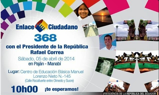 Este sábado 5 de abril se realizará el Enlace Ciudadano 368 desde Paján, en la provincia de Manabí. El presidente Rafael Correa dirigirá su informe semanal de labores desde el Centro de Educación Básica Manuel Lorenzo Nieto, este centro educativo se encuentra ubicado en la calle Rocafuerte entre Olmedo y Sucre.