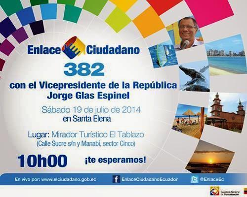 El vicepresidente de Ecuador, ingeniero Jorge Glas Espinel, será quien dirija el enlace ciudadano 382 de este sábado 19 de julio de 2014. Glas presentará el informe semanal por la ausencia del presidente Correa, quien viajó en días pasados al Brasil a una cumbre entre el grupo BRICS (Brasil, Rusia, India, China y Sudáfrica) y la UNASUR. Luego de la cumbre el Jefe de Estado viajará a Bélgica, país en el que permanecerá durante 13 días en goce de sus vacaciones anuales.