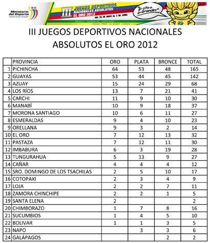 Medallero Juegos Deportivos Nacionales Absolutos El Oro 2012