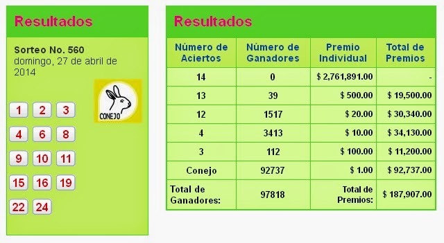| Resultados Pozo Millonario – Sorteo 560 del 27 de abril de 2014 |
